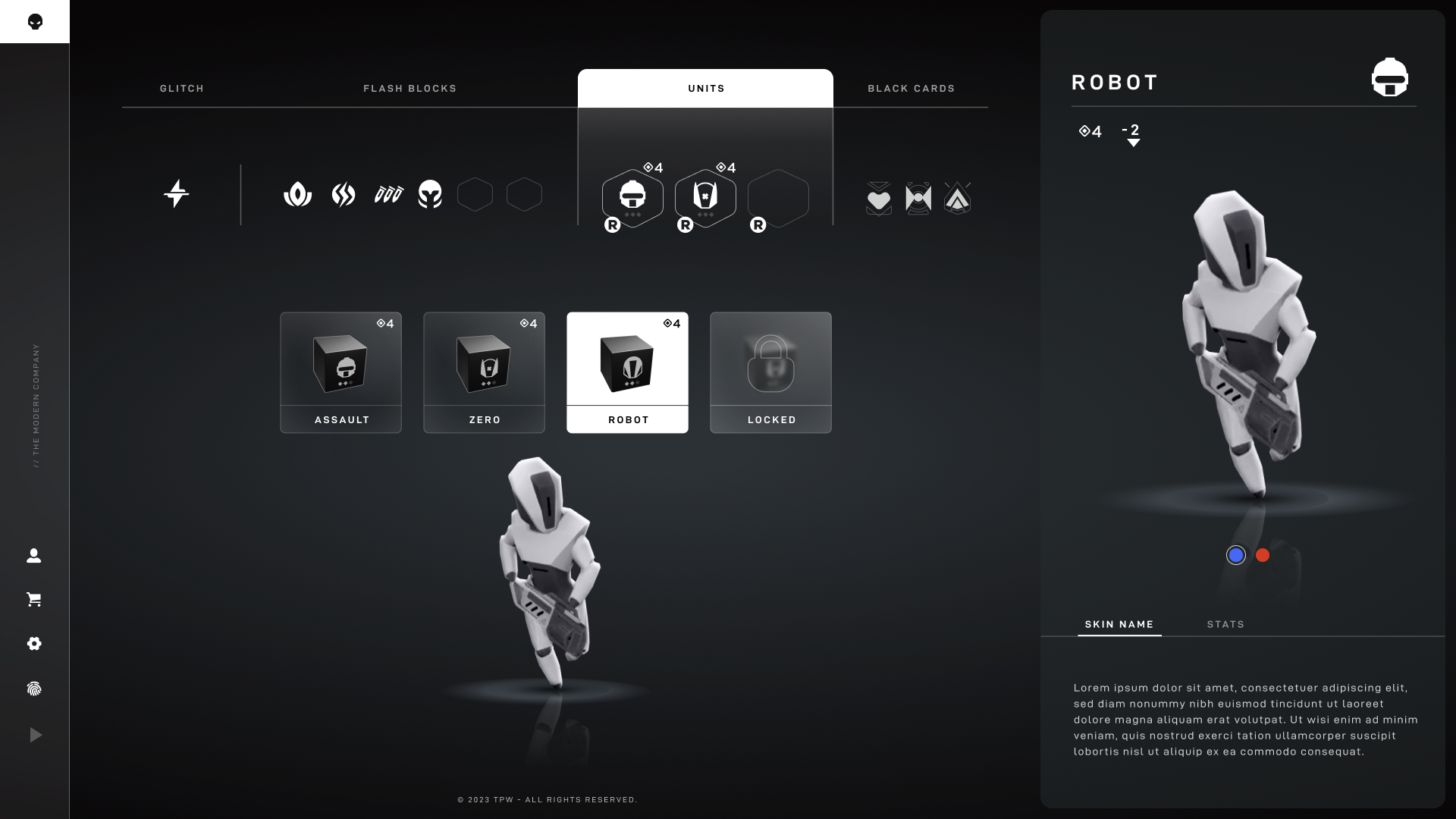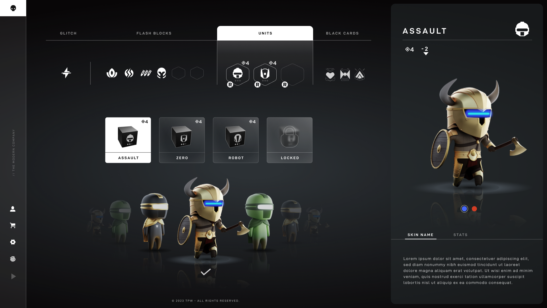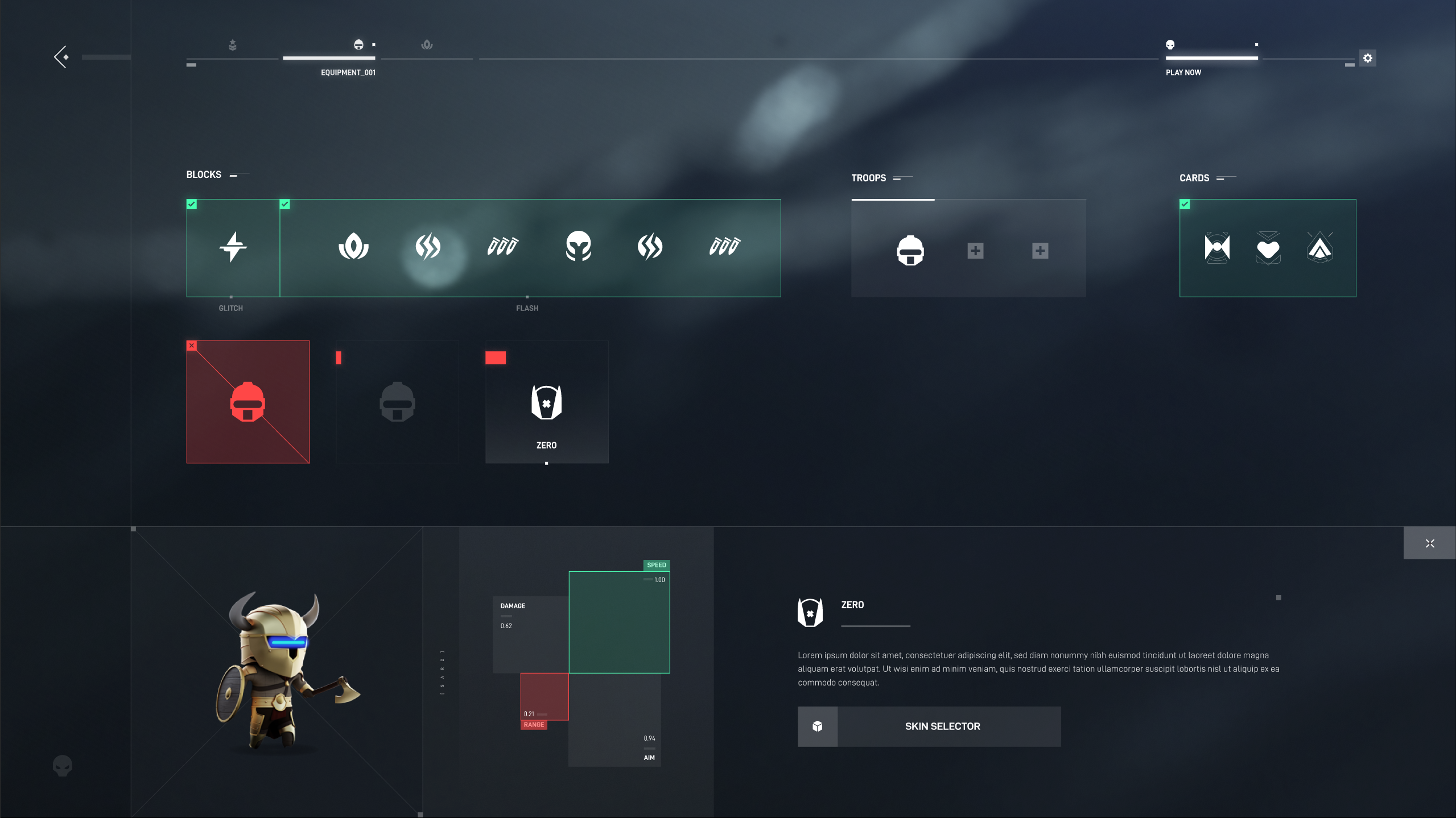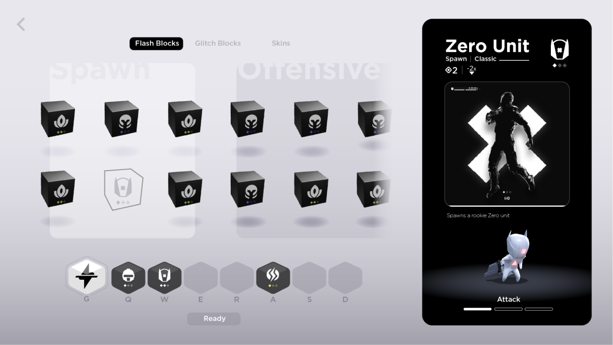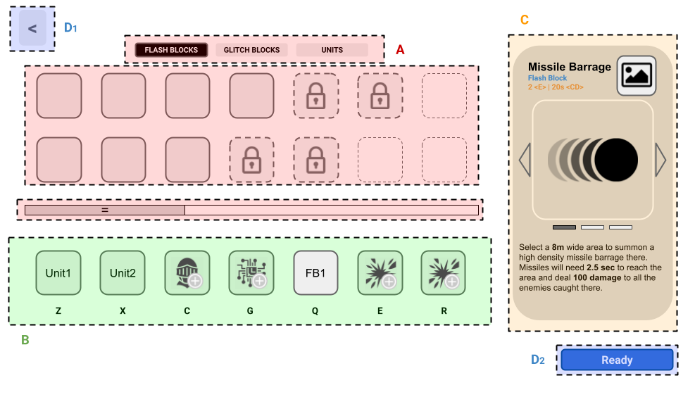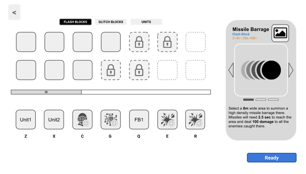 Pre-Match Selection Screen will allow players to select their Units, Flash Blocks, Glitch Blocks and Skins before a match. It should provide a quick access to the available blocks selection, highlight all the necessary information and contain basic navigation functionality.
