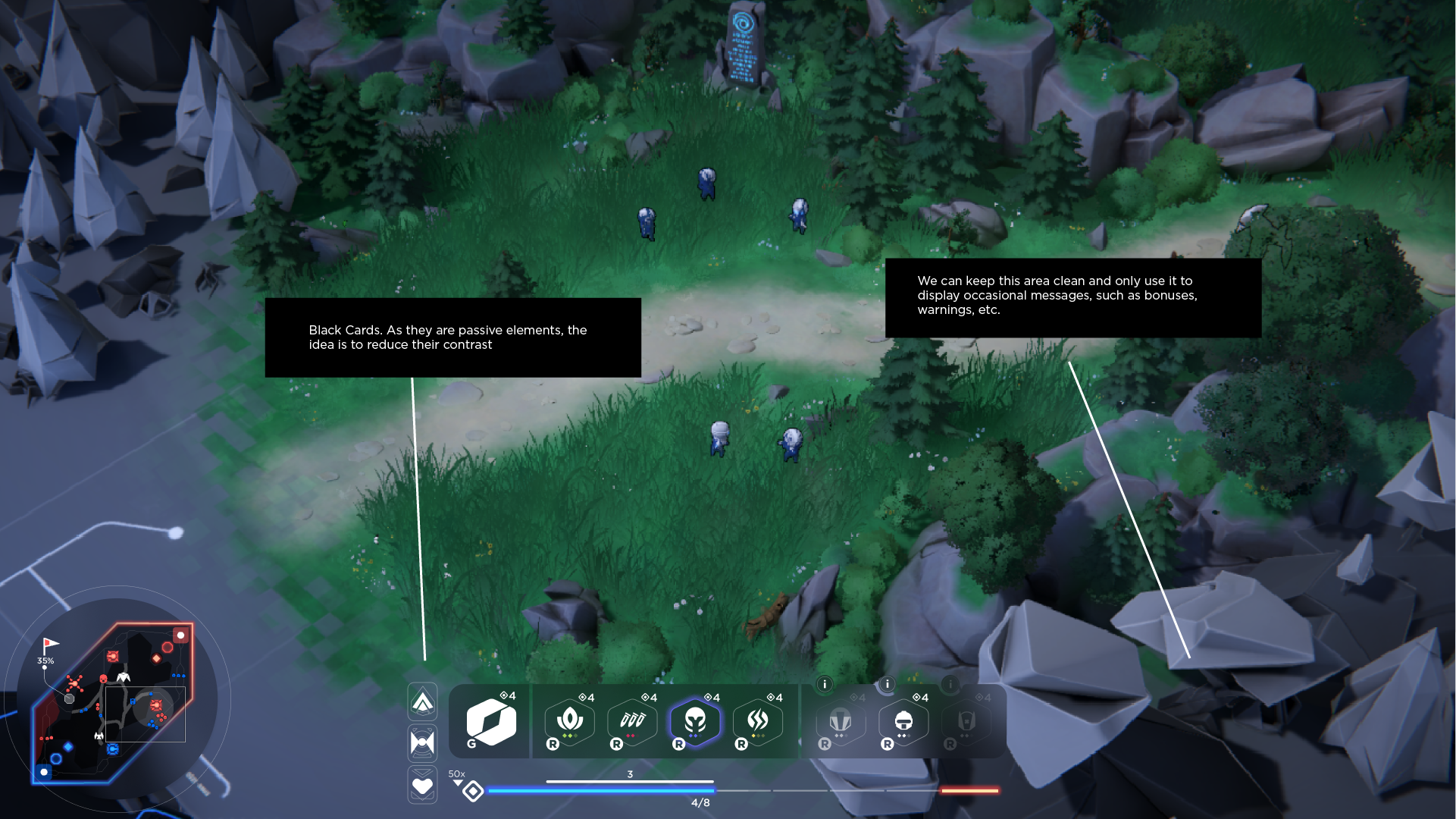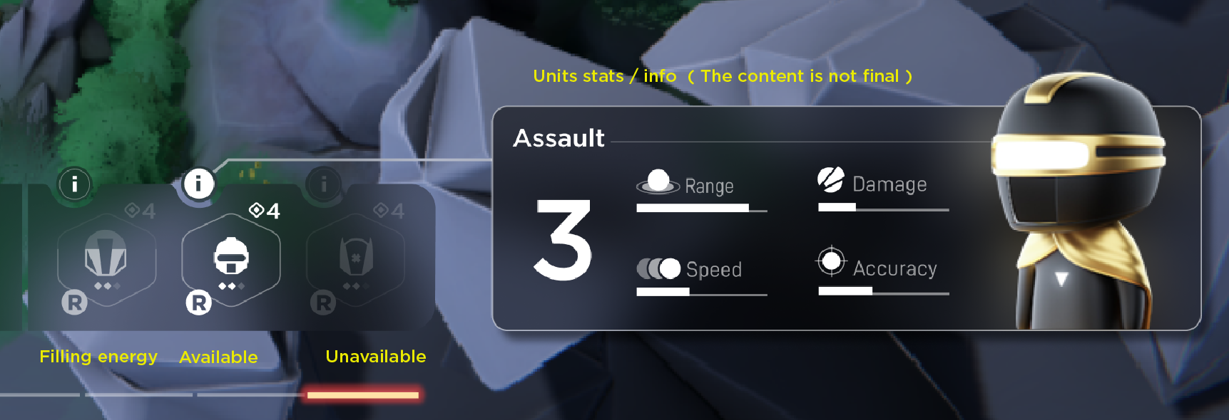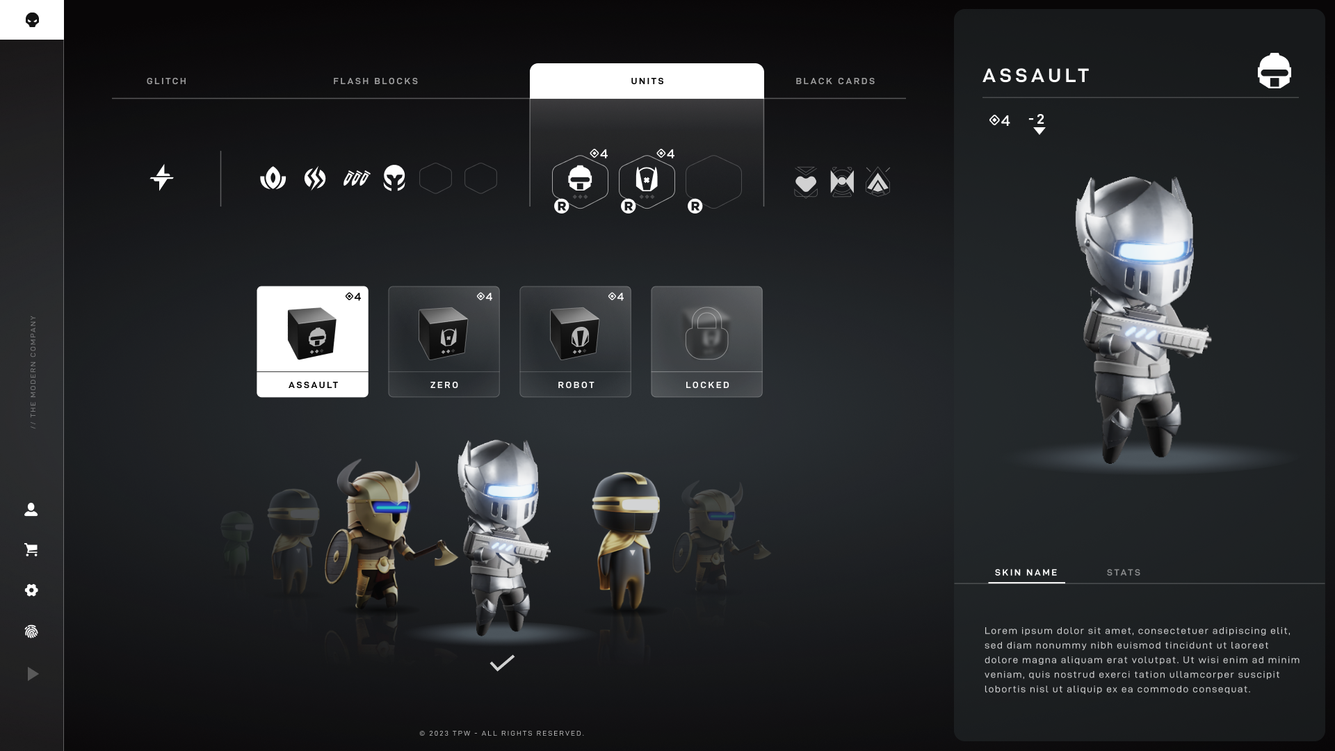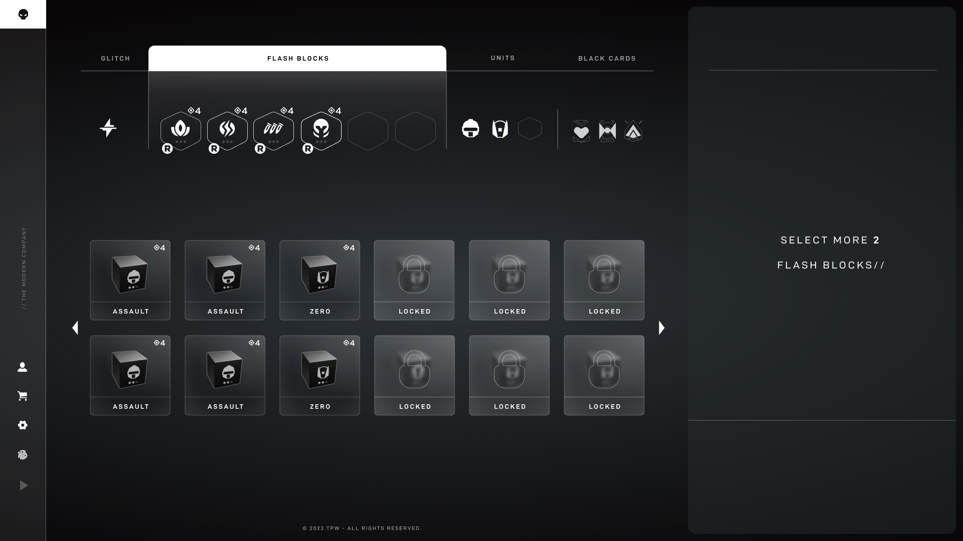 Pre-Match Selection Screen will allow players to select their Units, Flash Blocks, Glitch Blocks and Skins before a match. It should provide a quick access to the available blocks selection, highlight all the necessary information and contain basic navigation functionality.