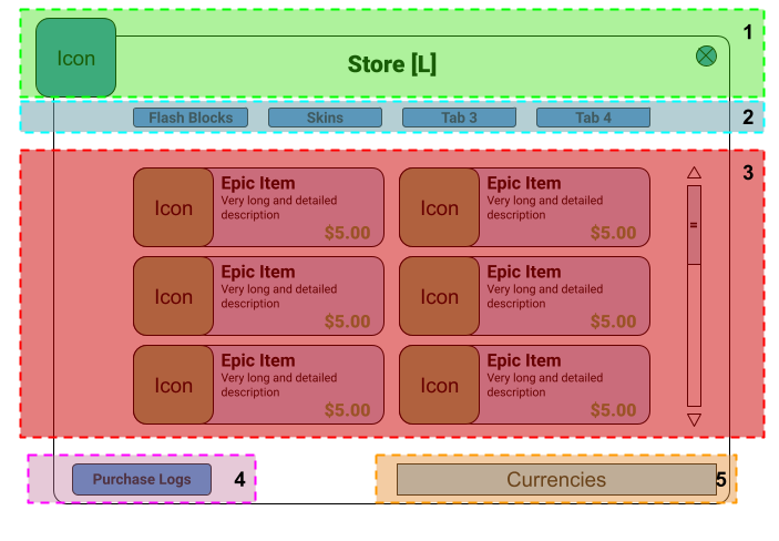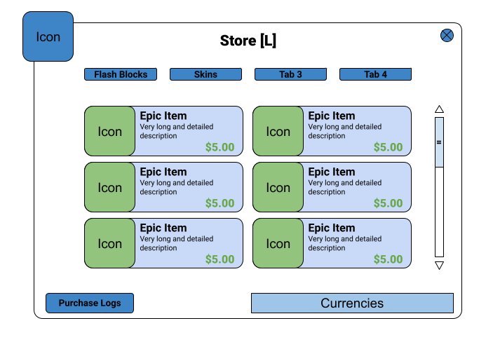 List of Items available for purchase on the tab selected above. Should contain 6~10 items on page and show navigation scrollbar in case all the available items do not fit on a single page. Each store position (item) should be fully customizable from the editor and contain the following: